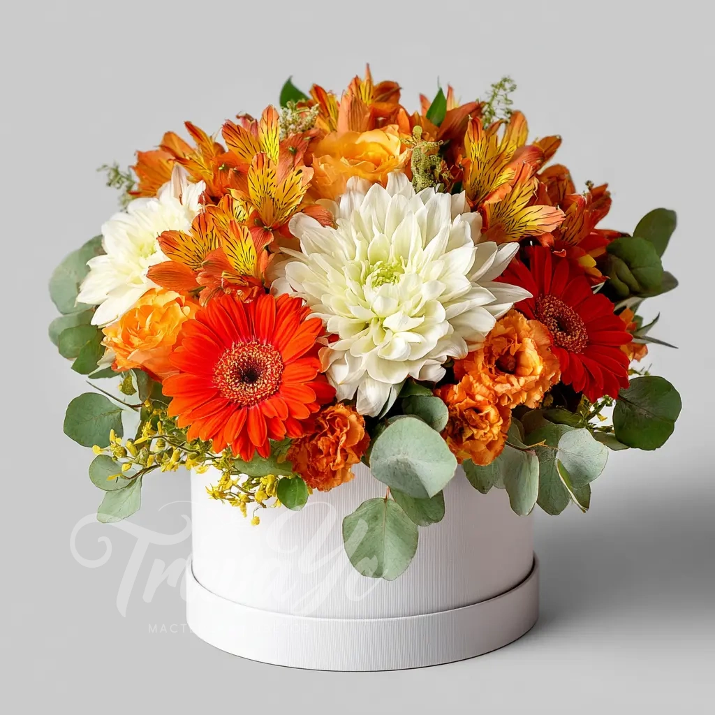 Теплые оттенки гербер, альстромерий и хризантемы дарят атмосферу уюта и тепла в прохладные дни. Отличный подарок для близких.