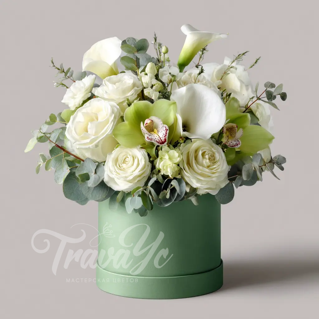 Зеленые орхидеи, каллы и эвкалипт — элегантная композиция для ценителей красоты и изящества.
