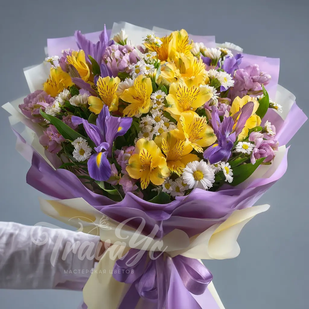 Композиция в жёлто-фиолетовой гамме — как всплеск света в пасмурный день. Альстромерии создают ощущение тепла и оптимизма. Прекрасно подойдёт для поднятия настроения или неожиданного подарка.