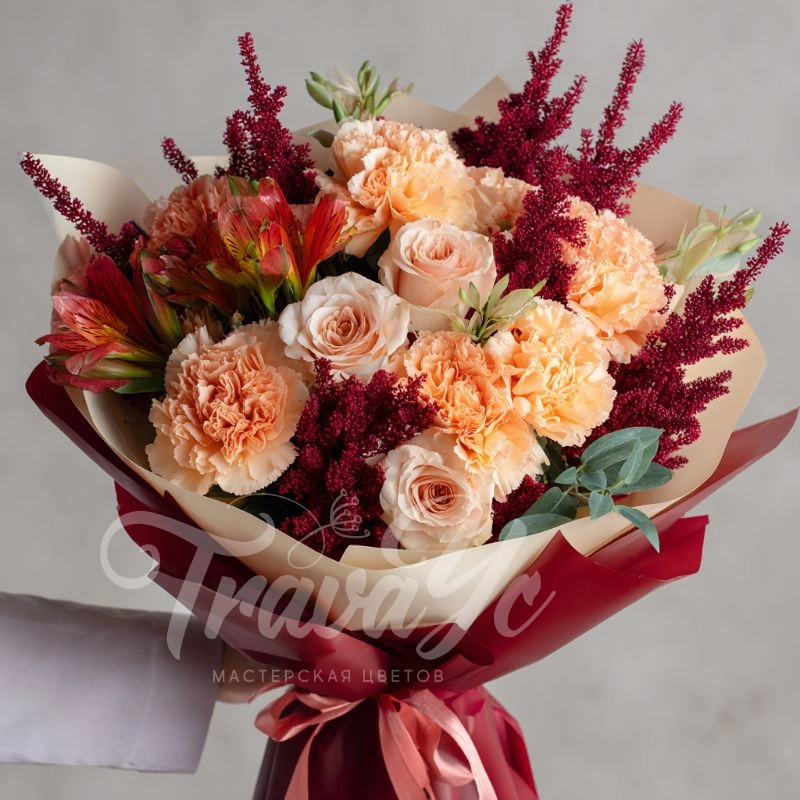 Кремовые гвоздики с бордовыми цветами — загадочный и благородный букет, создающий атмосферу роскошного вечера и незабываемого момента.