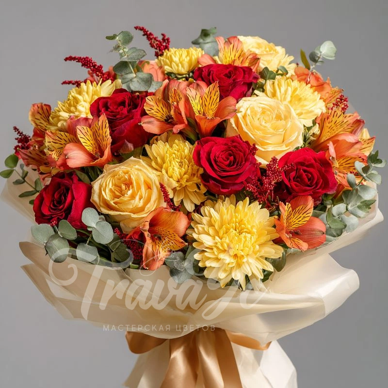 Глубокие, насыщенные оттенки этого букета напоминают о первых холодных вечерах и тёплых шарфах. Хризантемы в нём — как живые огоньки сентябрьского вечера. Стильно, сдержанно и по-осеннему уютно.
