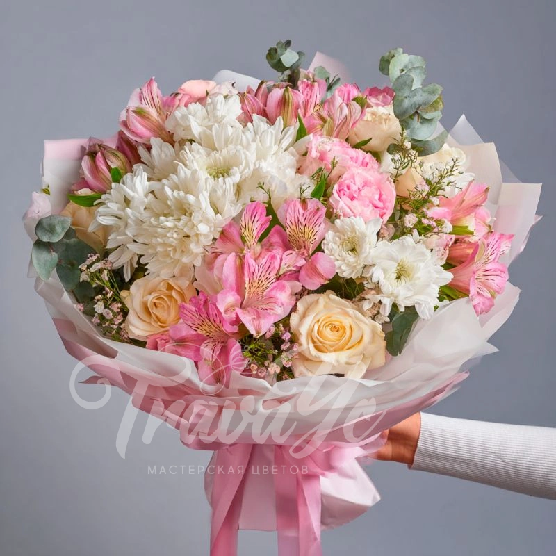 Сдержанная композиция в светлой гамме с белыми, кремовыми и розовыми оттенками. Хризантемы символизируют чистоту и уважение, а оформление делает букет универсальным для любого случая.