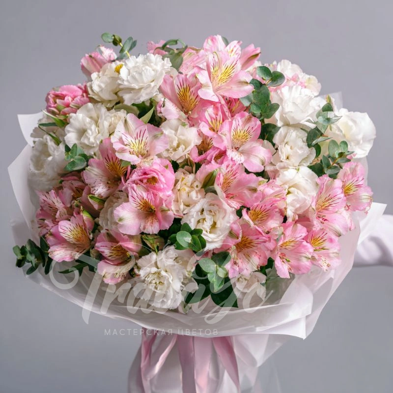 Белые эустомы создают образ вдохновляющей легкости. Букет символизирует ясность мыслей и чистоту намерений. Хороший вариант для творческих людей или особенных дат.