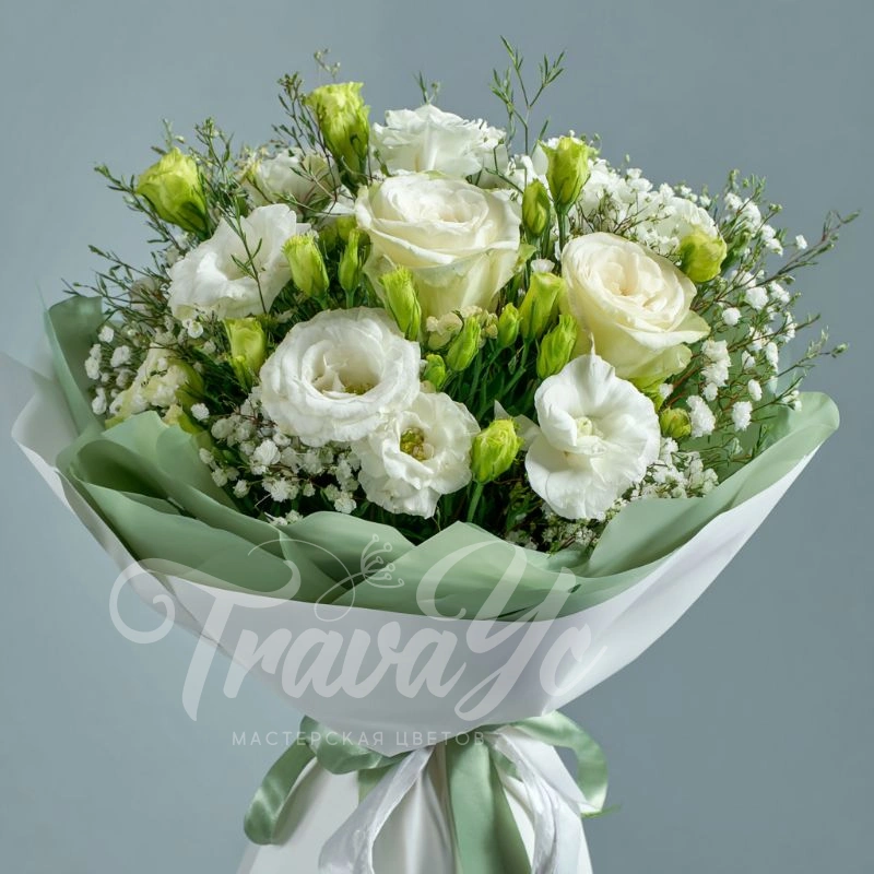 Белоснежная гамма и тонкие стебли — словно звон хрустального ветра. Эустомы придают композиции воздушность и элегантность. Букет, который говорит о любви, уважении и заботе.