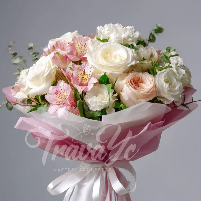 Трепетный, «припудренный» букет с эустомами в нежной палитре. Его выбирают те, кто хочет подчеркнуть деликатность и тонкость чувств. Эстетичный подарок, который останется в сердце.