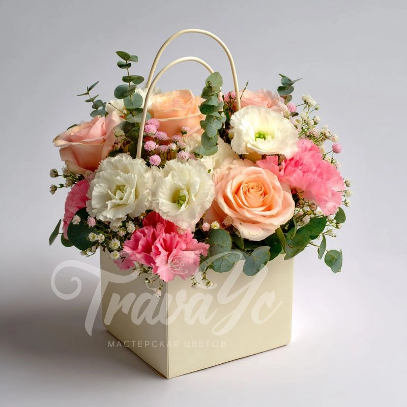 ГлавнаяКаталогКомпозицииЦветы в сумочке «Миниатюрное вдохновение»