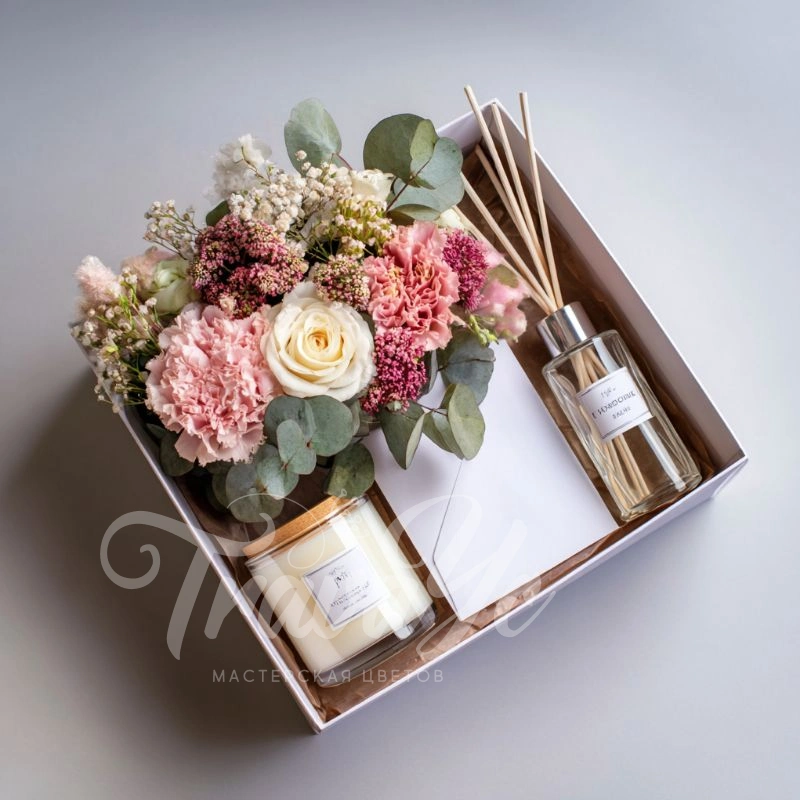 Этот набор, словно глоток чистого летнего воздуха, наполнит ваш дом лёгкостью и цветочной гармонией. Нежная флористическая композиция, интерьерная свеча и тонкий шлейф аромата из диффузора создадут атмосферу пробуждения и радости.
