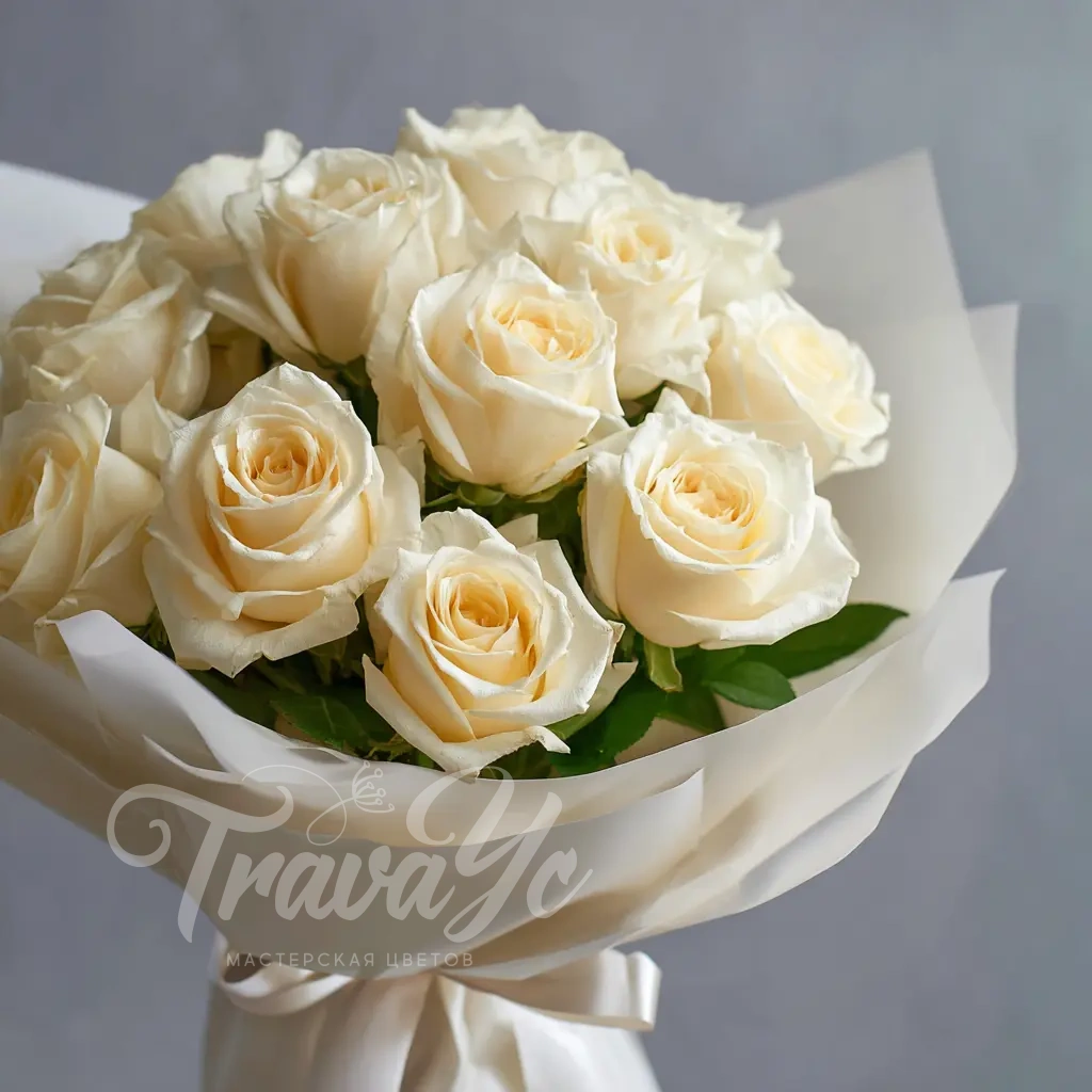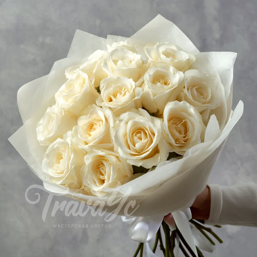 Невесомый и светлый букет из 15 белых роз высотой 40 см — символ чистоты и уважения. Идеален для официальных поздравлений, школьных мероприятий и трогательных моментов.