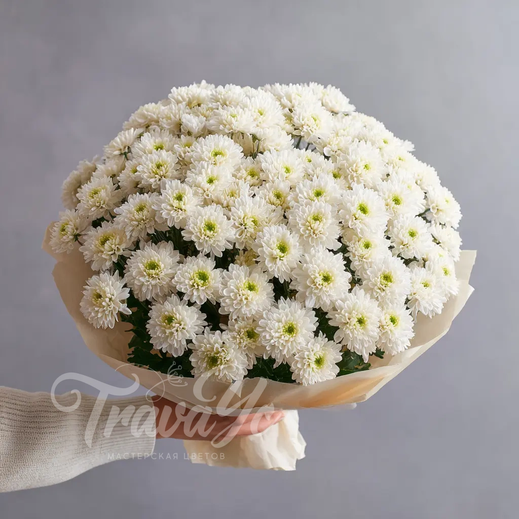 Классический букет из белых кустовых хризантем. Подойдёт для офиса, поздравлений, свиданий и просто — чтобы сделать день ярче.